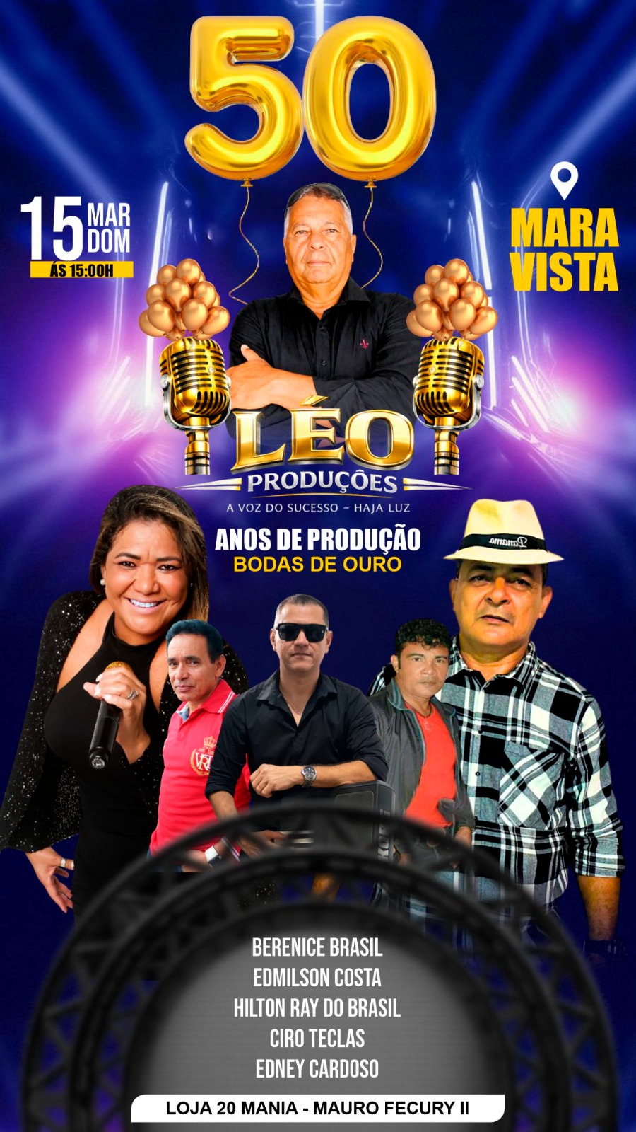 No prĂłximo dia 15 de março (domingo) serĂĄ realizada a comemoração especial dos 50 anos de LĂ©o ProduçÔes â Bodas de Ouro, um evento que promete muita mĂșsica e animação para o pĂșblico.