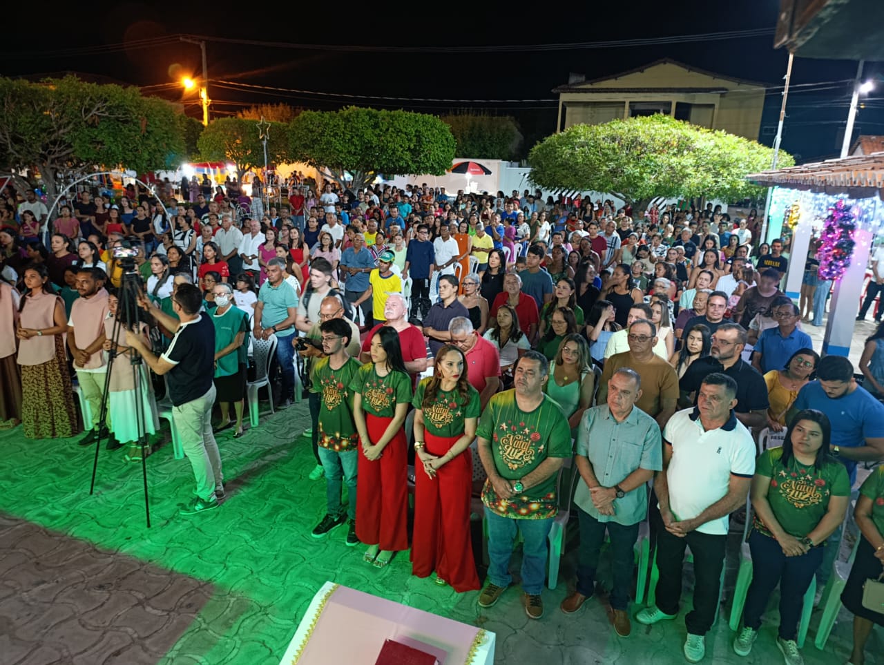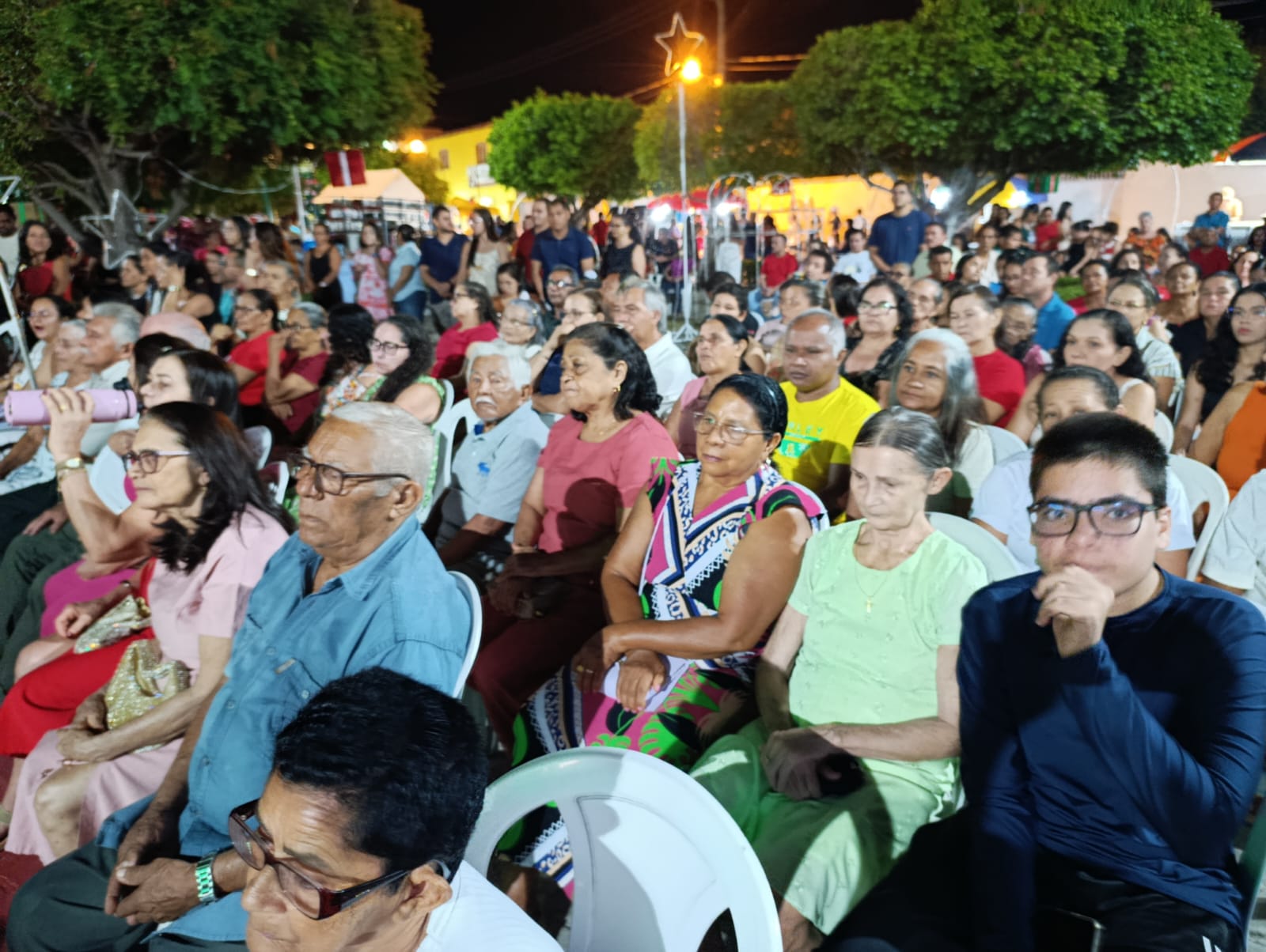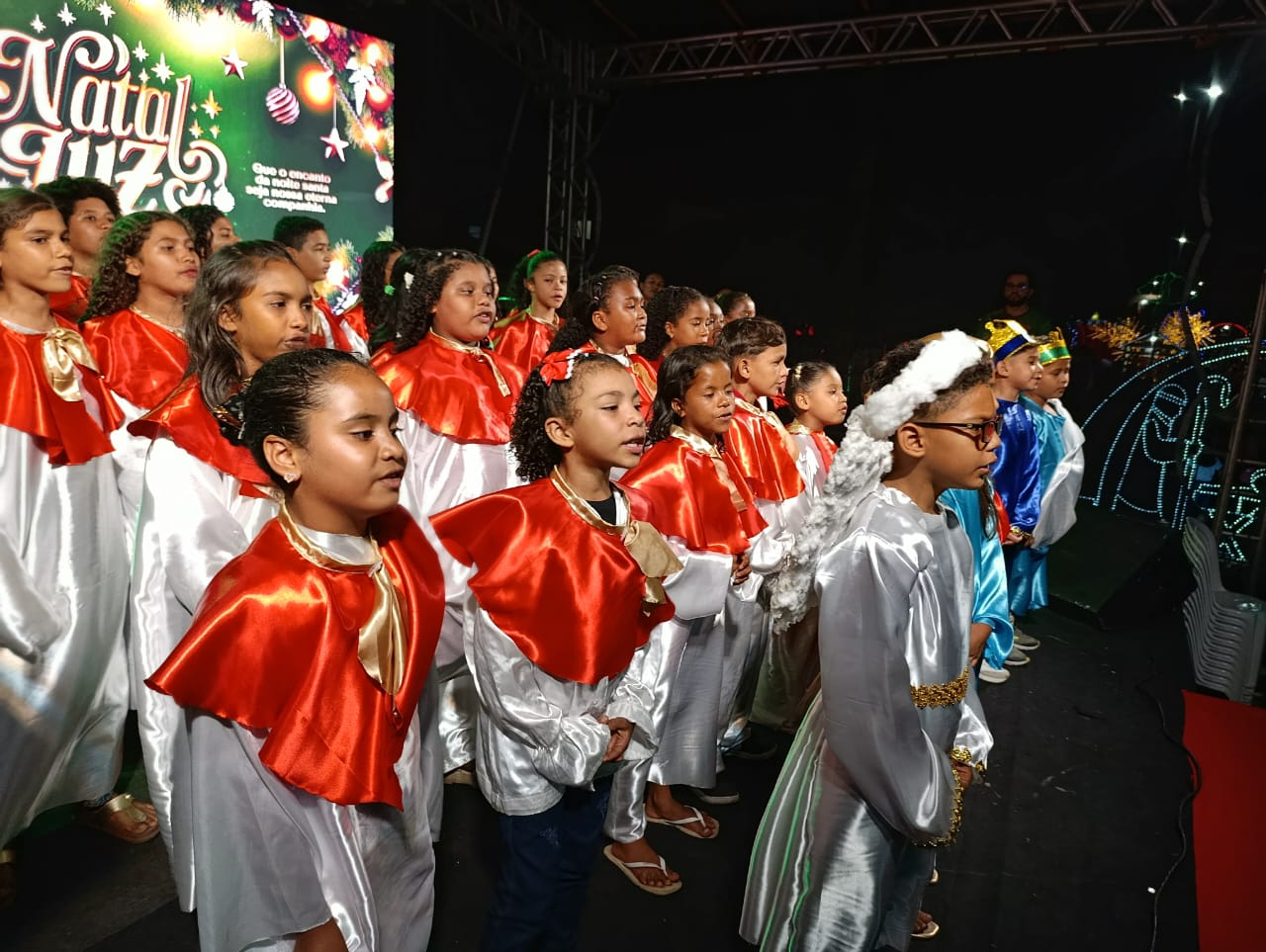 A programação teve início com Missa Campal, seguida por apresentações musicais infantis, que emocionaram o público presente, e culminou com o aguardado acendimento das luzes, momento que arrancou aplausos e encantou famílias inteiras. A praça iluminada se tornou o grande símbolo da noite, reforçando o clima de união e confraternização.