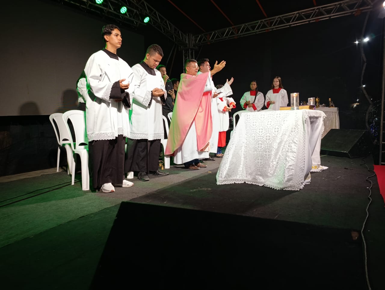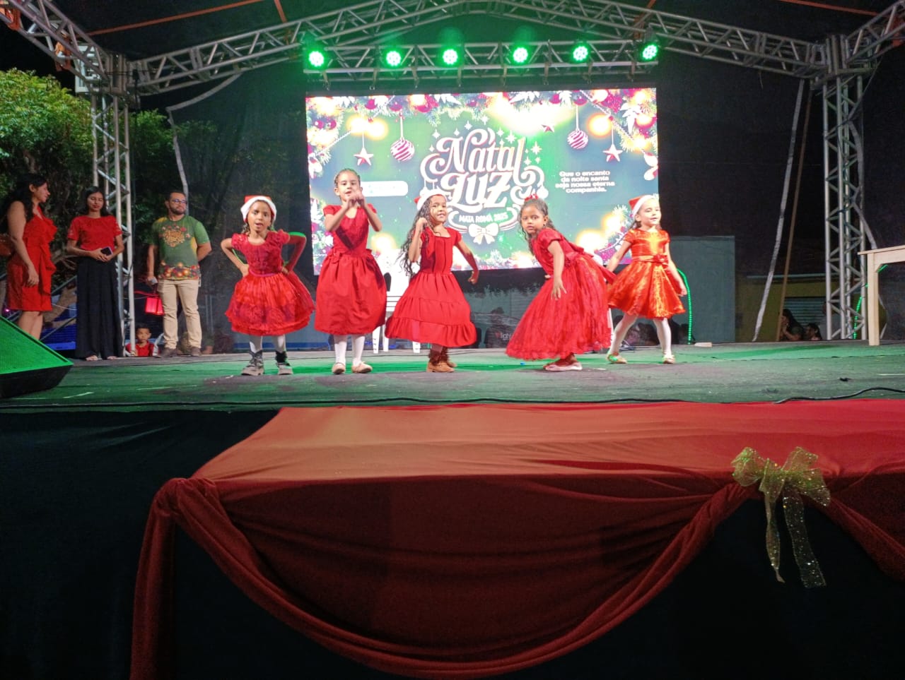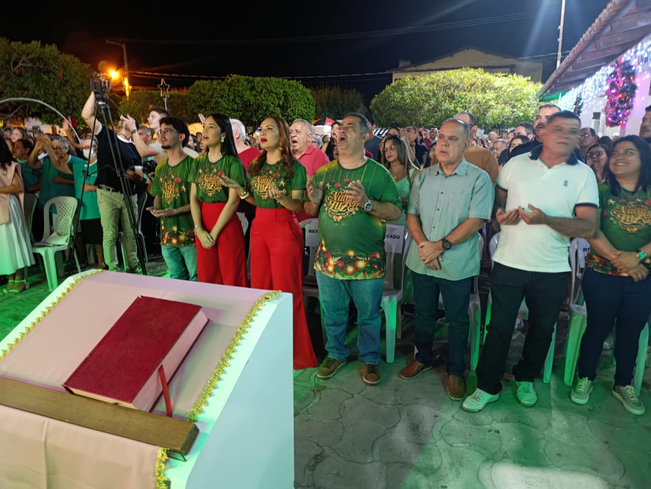 A programação teve início com Missa Campal, seguida por apresentações musicais infantis, que emocionaram o público presente, e culminou com o aguardado acendimento das luzes, momento que arrancou aplausos e encantou famílias inteiras. A praça iluminada se tornou o grande símbolo da noite, reforçando o clima de união e confraternização.