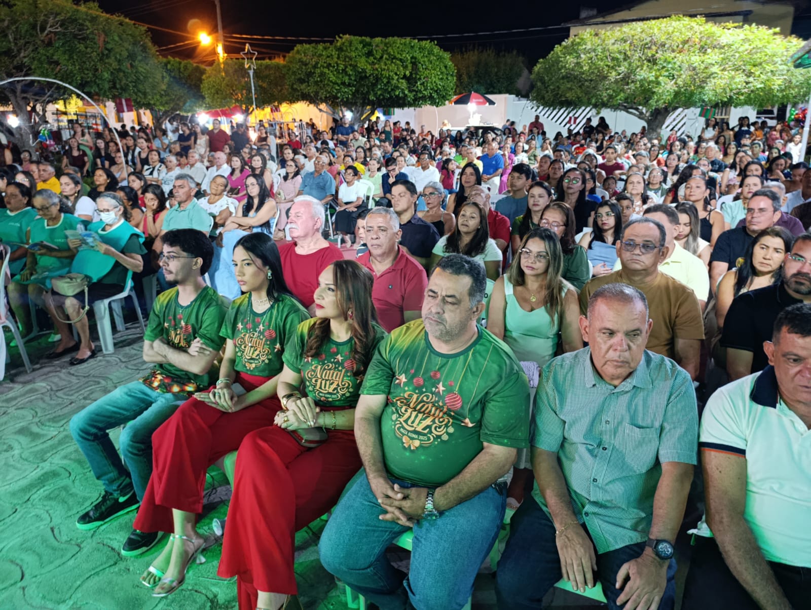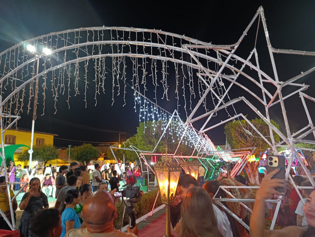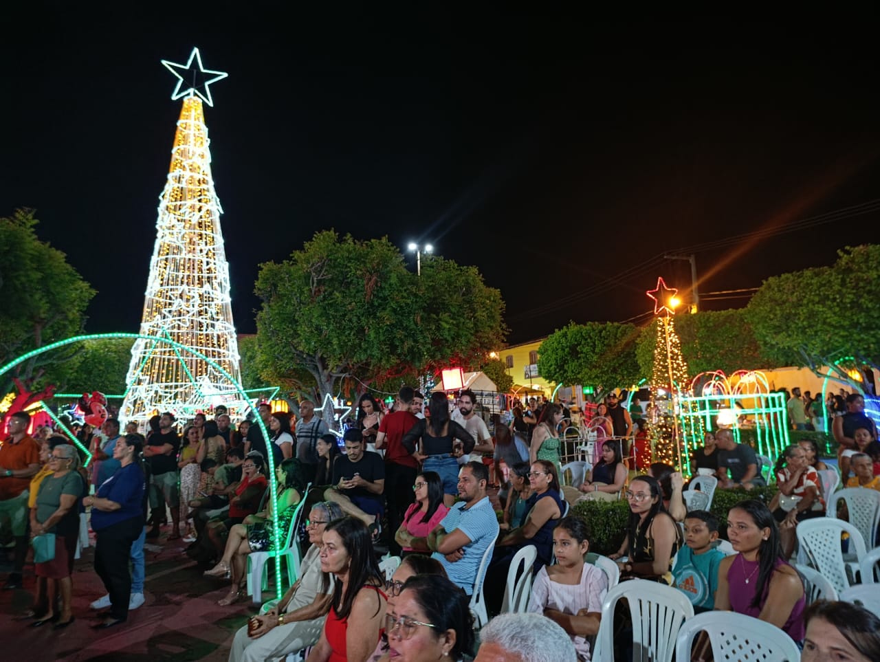 A programação teve início com Missa Campal, seguida por apresentações musicais infantis, que emocionaram o público presente, e culminou com o aguardado acendimento das luzes, momento que arrancou aplausos e encantou famílias inteiras. A praça iluminada se tornou o grande símbolo da noite, reforçando o clima de união e confraternização.