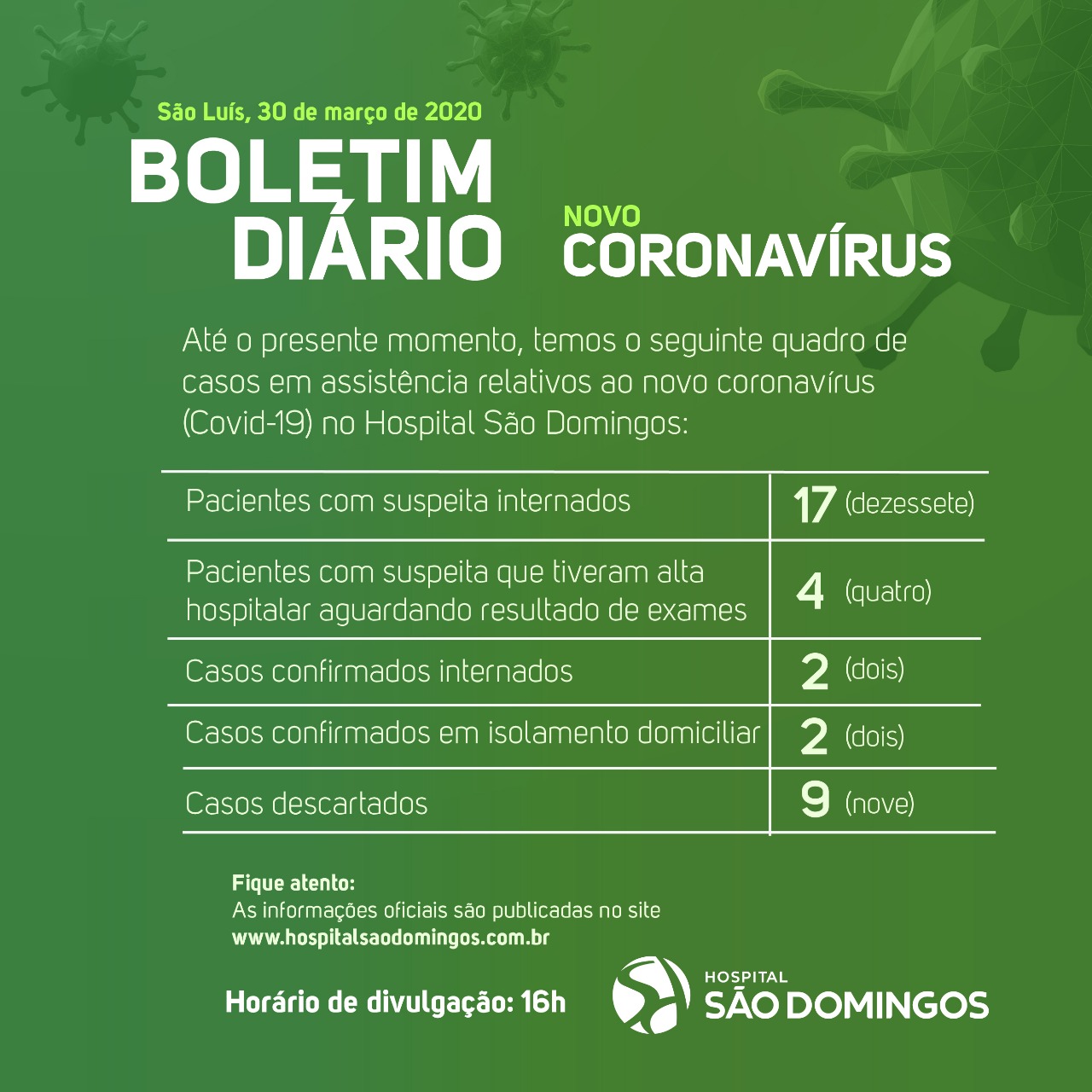 Em seu boletim diário divulgado na tarde desta segunda-feira (30), o Hospital São Domingos informou que 17 pacientes internados naquela unidade de saúde estão em situação de suspeita para coronavírus, sendo que dois internados estão confirmados, além de outros dois outros casos testados positivamente em isolamento domiciliar.