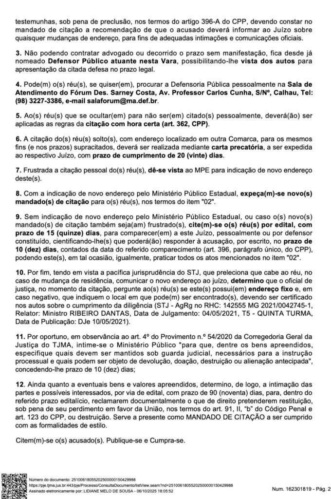 A denúncia foi recebida pela juíza Lidiane Melo de Souza, da 2ª Vara Criminal de São Luís, em decisão assinada no dia 6 de outubro de 2025. O documento determinou a citação formal dos acusados e destacou que há provas suficientes para abertura da ação penal.